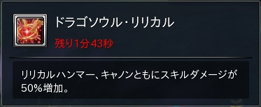 ・「天血解放」状態になり「天槌の力」スキルも「天砲の力」スキルも常時発動する。30秒持続。 ・天血ゲージにエネルギーが満ちている状態でのみ使用可能。解放でゲージはリセットされる。天血解放中の30秒間は天血ゲージが溜まらない。その後さらに30秒間クールタイム状態となるが、その間は天血ゲージが溜まらない上に天槌・天砲スキルの発動も不可となる。 ・天血ゲージ解放時に色の混在が無く100%ピンクだった場合は、同時に「ドラゴンソウル・ハンマー」状態が発動する。リリカルハンマーのスキルダメージが100%増加する。こちらは2分間持続。 ・天血ゲージ解放時に色の混在が無く100%水色だった場合は、同時に「ドラゴンソウル・キャノン」状態が発動する。リリカルキャノンのスキルダメージが100%増加する。こちらも2分間持続。 ・天血ゲージ解放時にちょうど50%ずつ色が溜まっていた場合は、同時に「ドラゴンソウル・リリカル」状態が発動する。リリカルハンマーもリリカルキャノンもスキルダメージが50%増加する。こちらも2分間持続。 ・3種のドラゴンソウル同士は重複できる。自身のバフ欄でドラゴンソウルの種類や残り時間は確認可能。 ・ドラゴンソウルのダメージ増加と「天槌の力」や「天砲の力」のダメージ増加も重複する。合計で200%増あるいは150%増の状態に出来る。 |